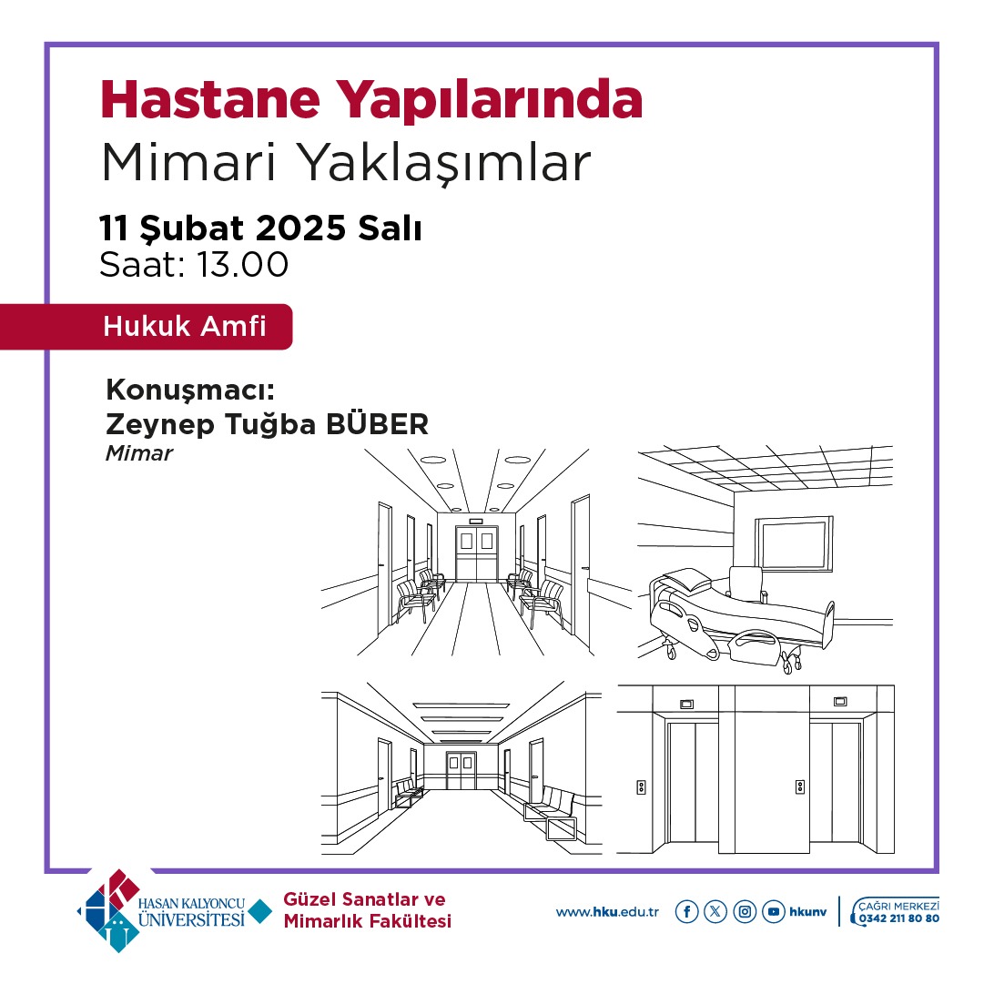 | Açiklama | HKÜ Güzel Sanatlar ve Mimarlık Fakültesi olarak Mimar Zeynep Tuğba Büber’i “Hastane Yapılarında Mimari Yaklaşımlar” isimli Semineriyle 11 şubat saat 13.00’de Hukuk Amfi’de ağırlayacağız. Siz değerli öğrencilerimizi ve meslekdaşlarımızı aramızda görmekten mutluluk duyarız. |