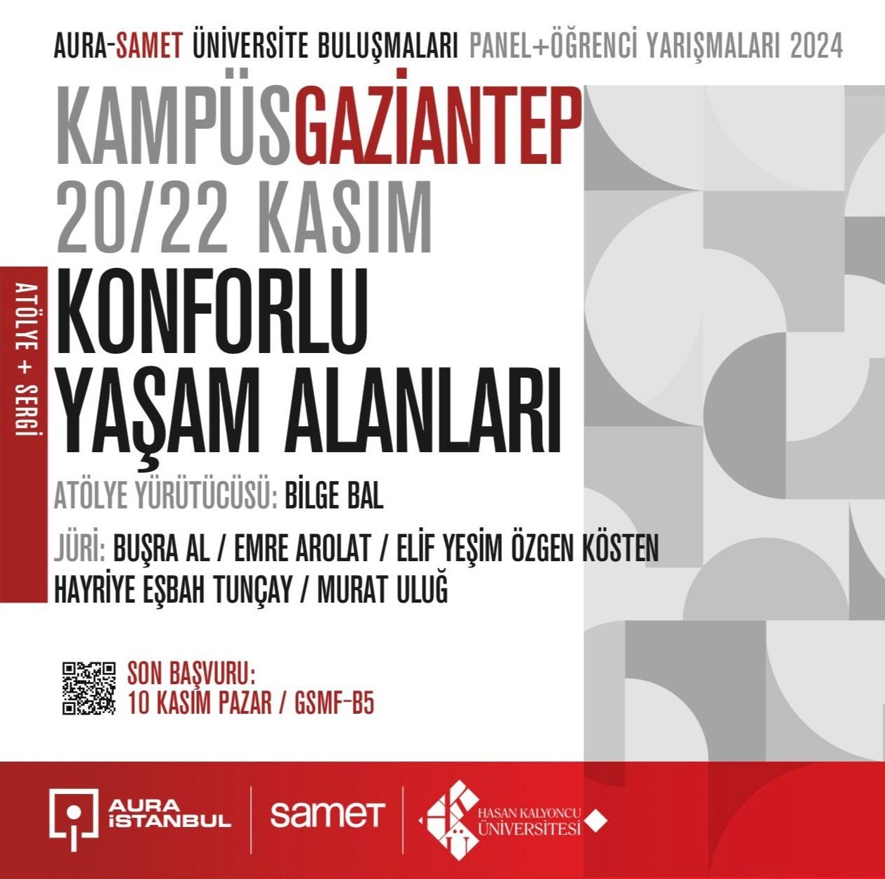 Mimarlık ile İç Mimarlık ve Çevre Tasarımı alanlarında kendilerine daha derin bir boyut katmak isteyen, tasarıma ilgi duyan Güzel Sanatlar ve Mimarlık Fakültesi öğrencilerimizle birlikte 20-22 Kasım 2024 tarihlerinde “Konforlu Yaşam Alanları” üzerine atölye gerçekleştirilecektir. Mimar Bilge Bal’ın yürütücülüğünü üstleneceği bu atölyede üretilecek projeler, jüri tarafından değerlendirecek ve seçilen projeler ödüllendirilecektir. Workshop 50 öğrenci ile sınırlı olacaktır. Katılmak isteyen öğrencilerimizin başvuru formunu doldurmaları gerekmektedir. Başvuru formu için tıklayınız. Atölye ve Yarışma içeriği için tıklayınız.